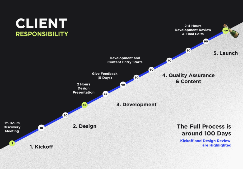 - 90 Days – Development Review + Final Edits 100 Days- Launch