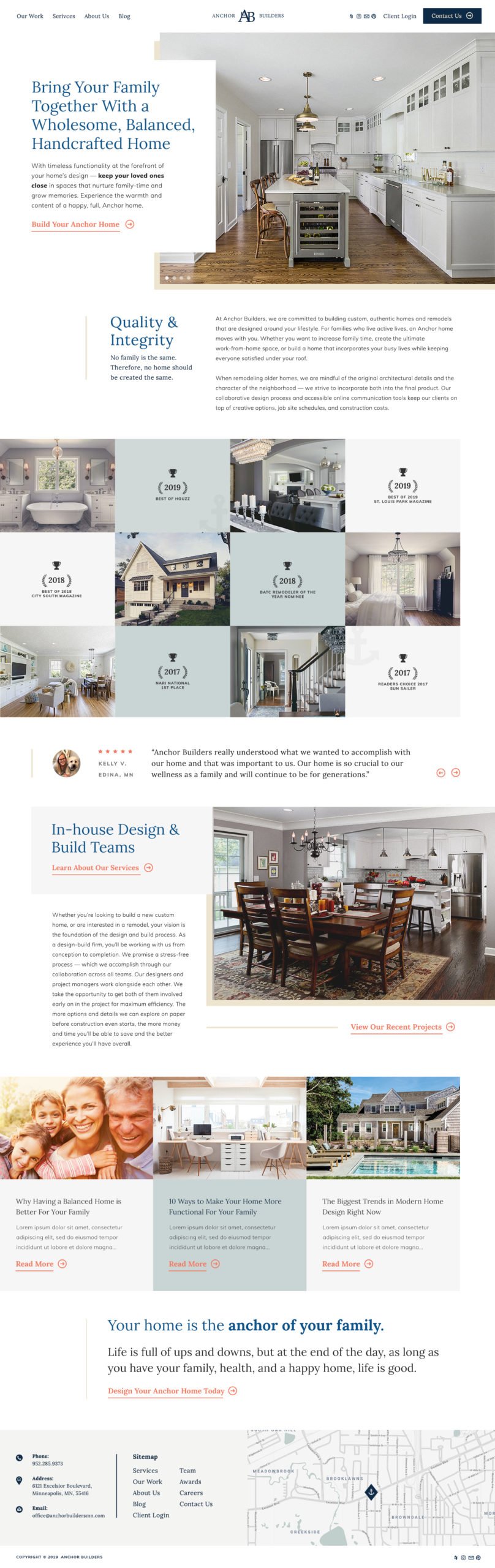 This site was built from the very beginning with a heavier emphasis on the headlines, as we started with the copywriting first. We identified the ideal customers of this company as folks who cared about a healthy and wholesome lifestyle and their kids. For that reason, we drew out those aspects in the wording of things, and actually identified a few headlines that could be used in other marketing materials as well. We were particularly proud of “The Home is The Anchor of Your Family,” and some of the headlines that make this high-end, white-space infused construction company website look phenomenal.